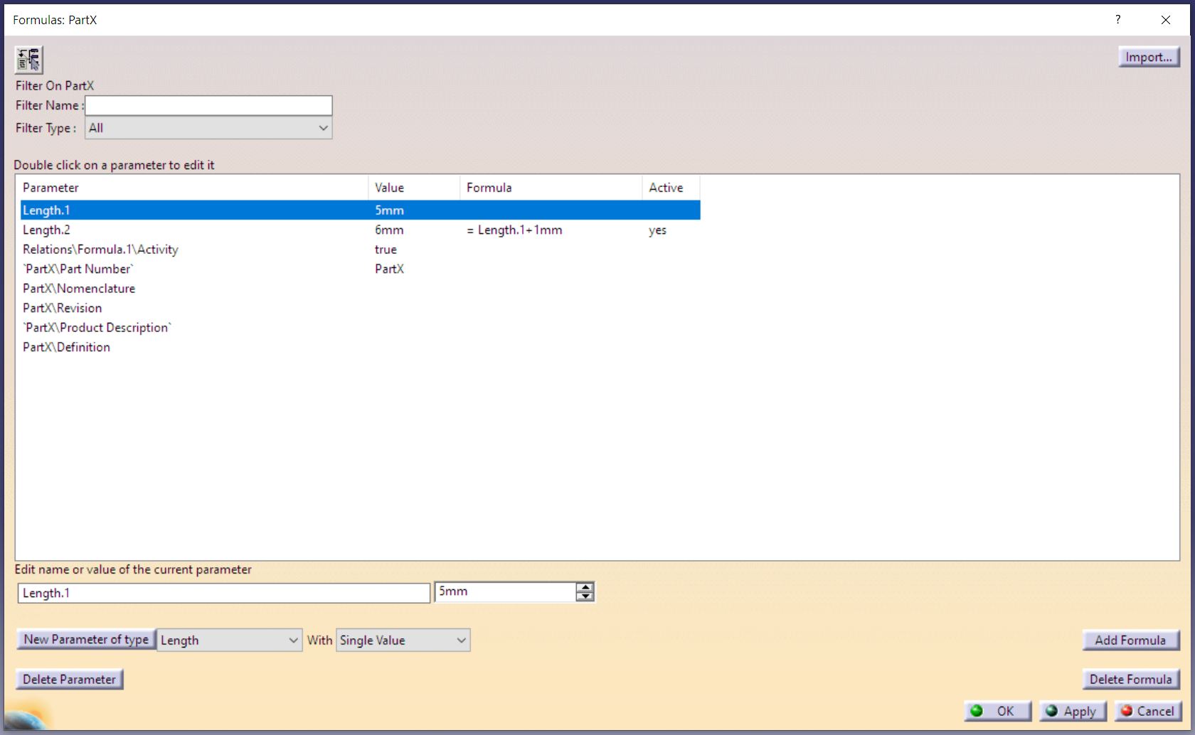 Une fois affiché vous pourrez les voir comme par exemple sur l’image ci-dessous. Dans l’arbre Catia il y à ici un Paramètre simple de longueur, et un deuxième qui est lié à une Formule : Lenght.1 + 1mm. On voit un petit chapeau sur l’icone du deuxième paramètre pour indiqué qu’une formule est lié. 😙